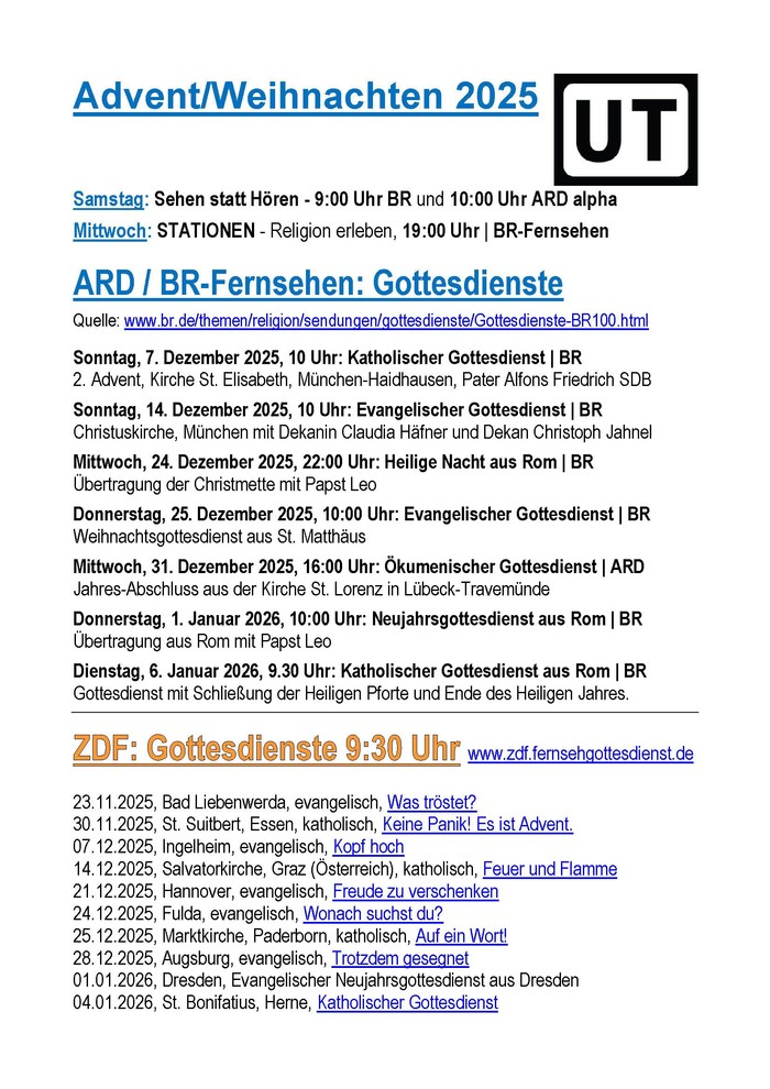 Auch in diesem Jahr gibt es rund um Advent und Weihnachten eine Vielzahl festlicher Fernseh- und Online-Angebote, die mit Untertiteln ausgestrahlt werden. Pfarrerin Barbara Eger hat eine Auswahl an Sendungen zusammengestellt, die den Zauber dieser besonderen Zeit auch für hörgeschädigte Menschen gut zugänglich machen.